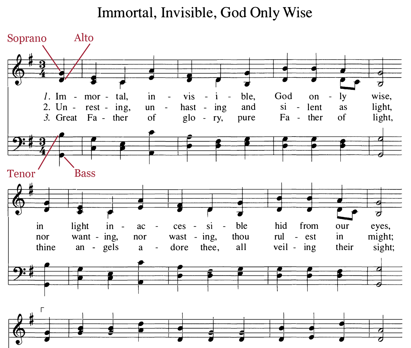 The songs in our hymnal are typically written in four parts: soprano, alto, tenorand bassThe first two are typically sung by women (and/or young boys before their voices change), with soprano for the higher voices and alto for the lower. Tenor and bass are sung by men, with higher and lower voices, respectively. Refer to the graphic below to see which note each part sings in our hymnals.