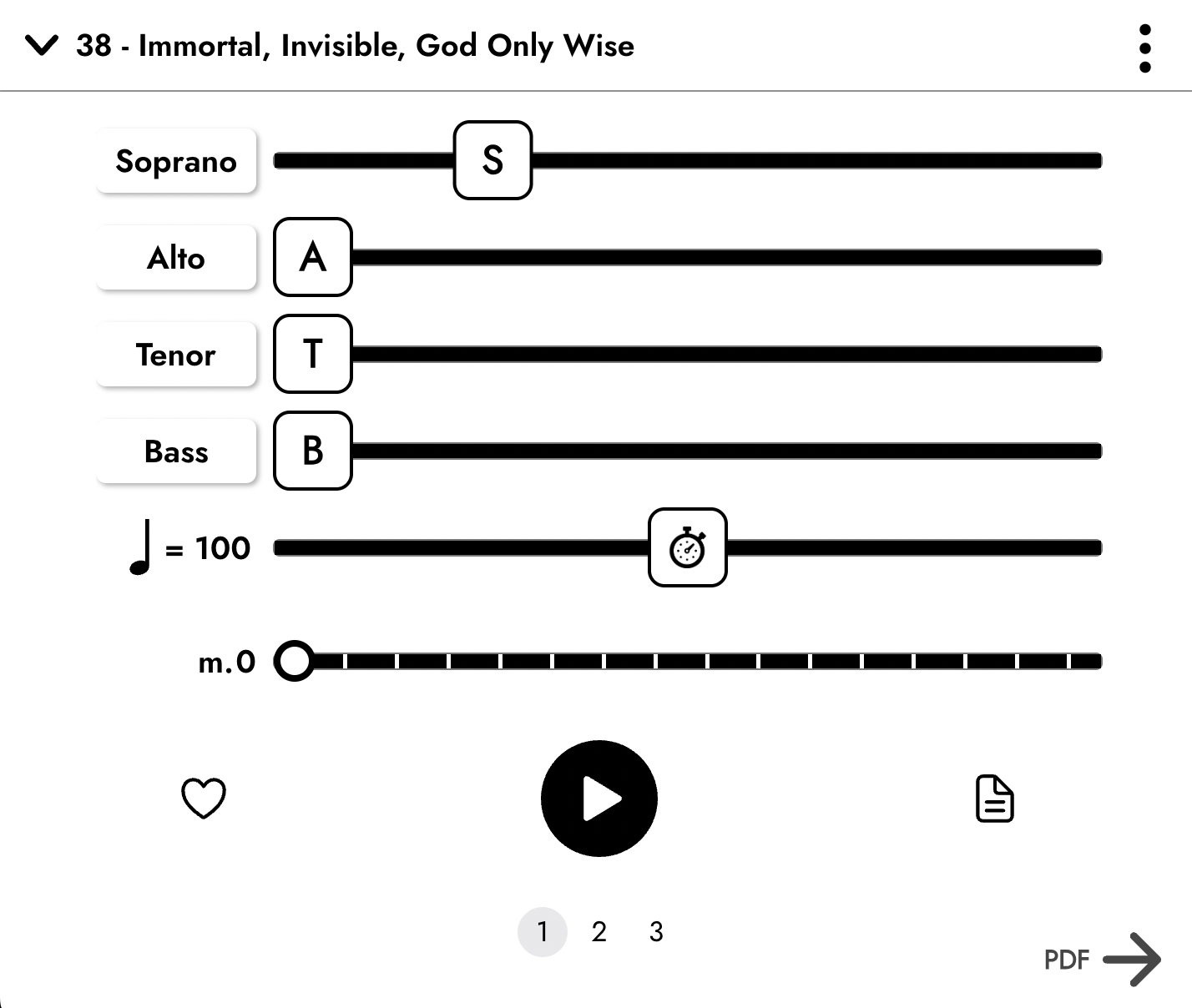 Each week, we upload the hymns we’ll sing to the Sing Your Part app so you can learn your part in advance. You can adjust the volume for each part to listen to whichever one you want (see the app screenshot below). You can also view the actual music as you listen to get a sense of how the part moves in reference to the musical notes.